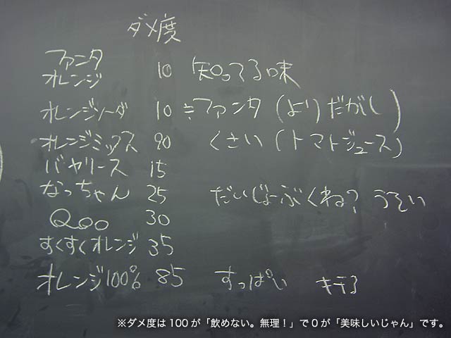 asanagiは果物が大嫌い。マジ嫌い。それは果汁0%のジュースは飲めるけど、100%はダメ!ってくらいの徹底振り。 どんだけ嫌いなんだよ、とは僕の周辺ではよく話題になるのですが、「一体、果汁何%から嫌いになるのか?」 の境界線を引こうという企画が持ち上がり、さっそくオレンジジュースを大量に買ってきました。0%、20%、24%、25%、30%、100%。順番に飲まされ飲んでいくと、25%の「Qoo」までは許せるという結論に達しました。 というかそんなことよりも十数年ぶりに果汁100%のジュースを飲んだんですよ!すごい!ぶっちゃけありえない! みなさんもこれだけは許せない!という好き嫌いありますかw?