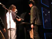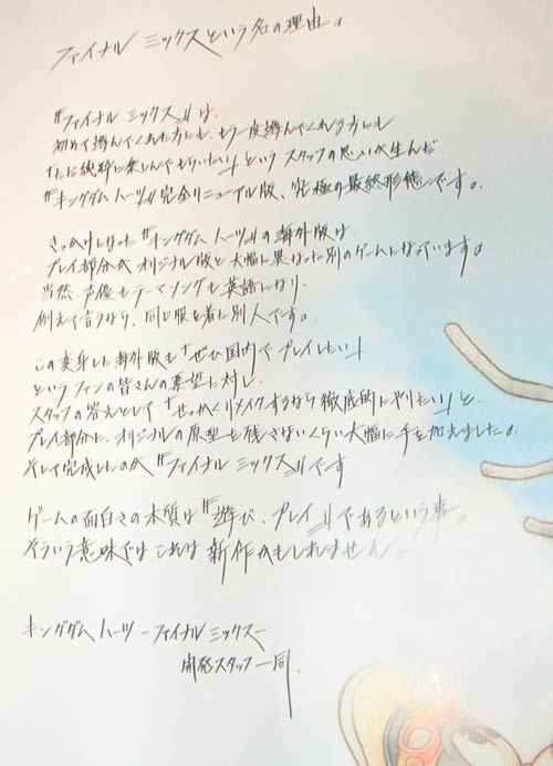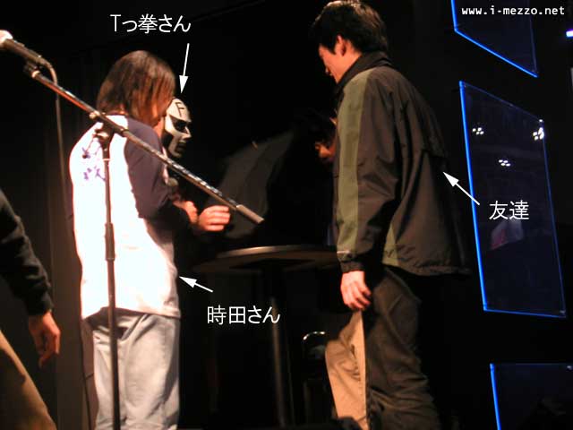 うだつ上がらない いきなりラヂオでお馴染みの「うだつあがらないブルース」! みんなものすごい勢いでうだつ上がってなかったです! ↓ なぞなぞ大会 なぞなぞに正解すると FFコンサート20020220のTシャツをプレゼント&記念撮影 このTシャツはTokyo International Forumを「Foum」って印刷しちゃったミスプリバージョン。 大量在庫を抱えて困ってるそうなので、在庫処分プレゼントらしです。しょぼいプレゼントw。 ↓ ミニライブ「Melodies Of Life」「Eyes On Me」 すげー豪華な二曲だ。 植松さんがパブリックな場所で演奏するのって、20年ぶりとかそのレベルらしいですよ! 実に貴重なセッションになりました。 ↓ 記念撮影 最後は会場のみなさんで記念撮影! この写真は後日PlayOnline.comにアップロードされるということで楽しみです。 ぼくも写っているハズなんですが、どうかな? ちなみに撮ったカメラは普通にサイバーショットでした。普通だ。