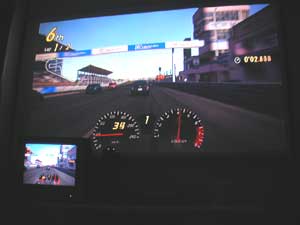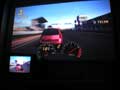 80インチのスクリーンでレースゲームをプレイ。左下は14インチテレビ