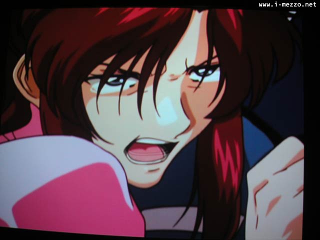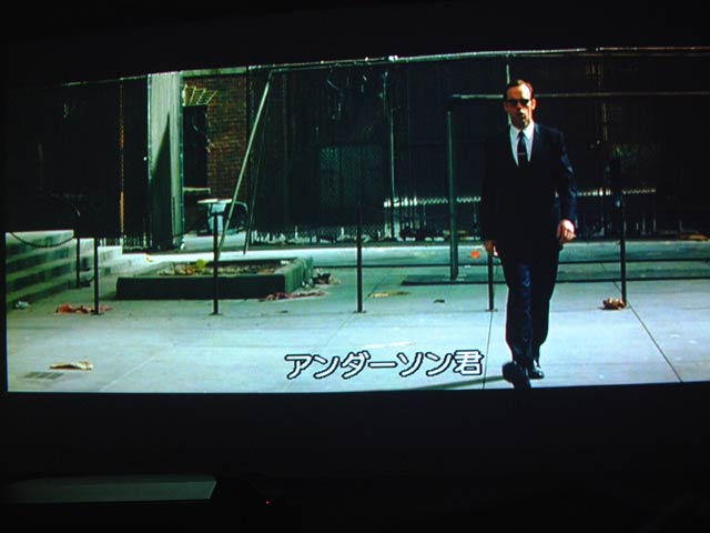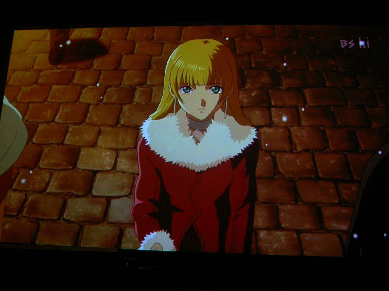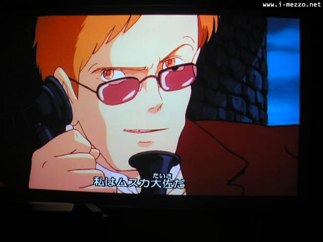 作品はメジャーなものが多いのでお手持ちの映像と比較しやすいかなぁ、と思います。ご覧のとおり、液晶プロジェクタではどうしても避けられないハズの粒状感がほとんど感じられません。「アンダーソン君」や「ムスカ大佐」参照。 かといって、シャープさは損なわれることなく、くっきりとした画です。字幕も見やすいですしね。フレイ様の口が半透明になってしまっていますけれど、これは口パクのコマとコマの境目だからです。PowerDVDによるプログレッシブ処理がうまくいっているためか、ジャギジャギになりません。