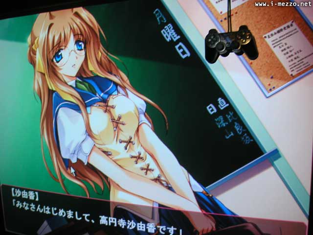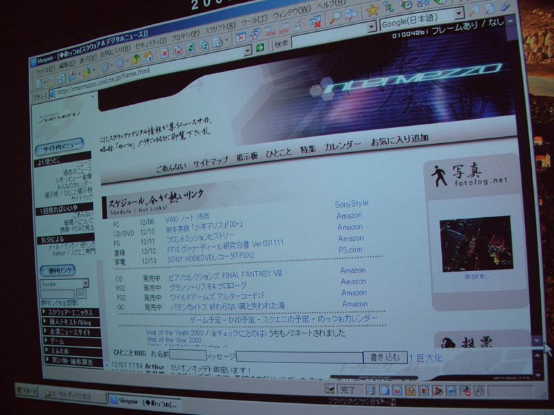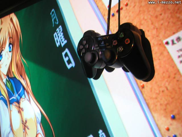 PS2の方はS端子接続のためかそこまで綺麗ではありません。ユウナの肩に置いたティーダの手が分身していますが、これは複数コマにまたがってデジカメが撮影したからです。(部屋が暗く、デジカメの露出時間が長くなるためこんなかんじになっていまいます) FFXの映像出力方式はインタレースのはずで、本来ならばジャギってしまいそうなものですが、それが半透明になっているというのはLP-Z2側のプログレッシブ処理がうまくいっているからではないでしょうか? ちなみに、ところどころにぶら下がっているPS2コントローラは画像との大きさ比較用にぶら下げてみましたw。