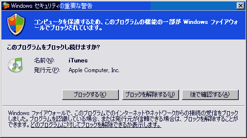 Windows XPのセキュリティ機能を大幅にアップさせる無料アップデート「SP2」は9月2日から公開されていて、自由にダウンロードできますが、CD-ROMが郵便局で配布されはじめました。最近は、ネット経由でSP2にバージョンアップしている最中に攻撃されかねないので、ネットに接続しなくてもバージョンアップできるCDって便利です。 というわけで、僕もついにSP2をインストールしました! インストール後、iTunesを起動したらこんなダイアログが出ました。アプリ一つ一つに対して、ネット接続の許可を設定できるのですよー。(INTERNET Watch)
